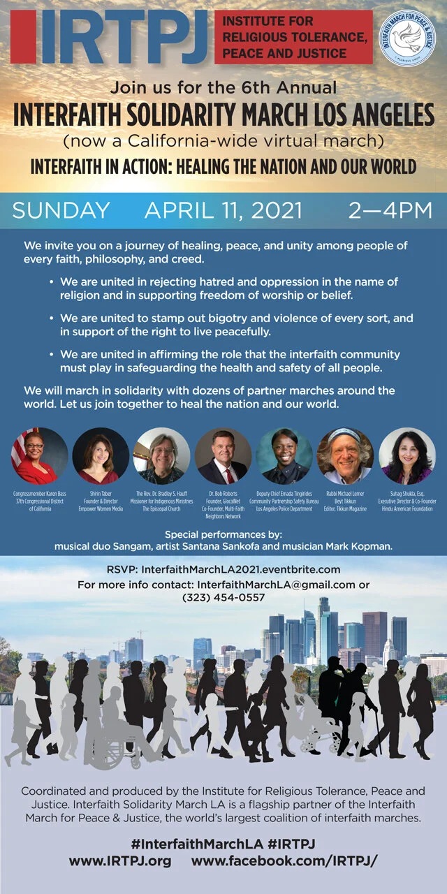 Coordinated and produced by the Institute for Religious Tolerance, Peace and Justice. Interfaith Solidarity March LA is a flagship partner of the Interfaith March for Peace & Justice, the world's largest coalition of interfaith marches.