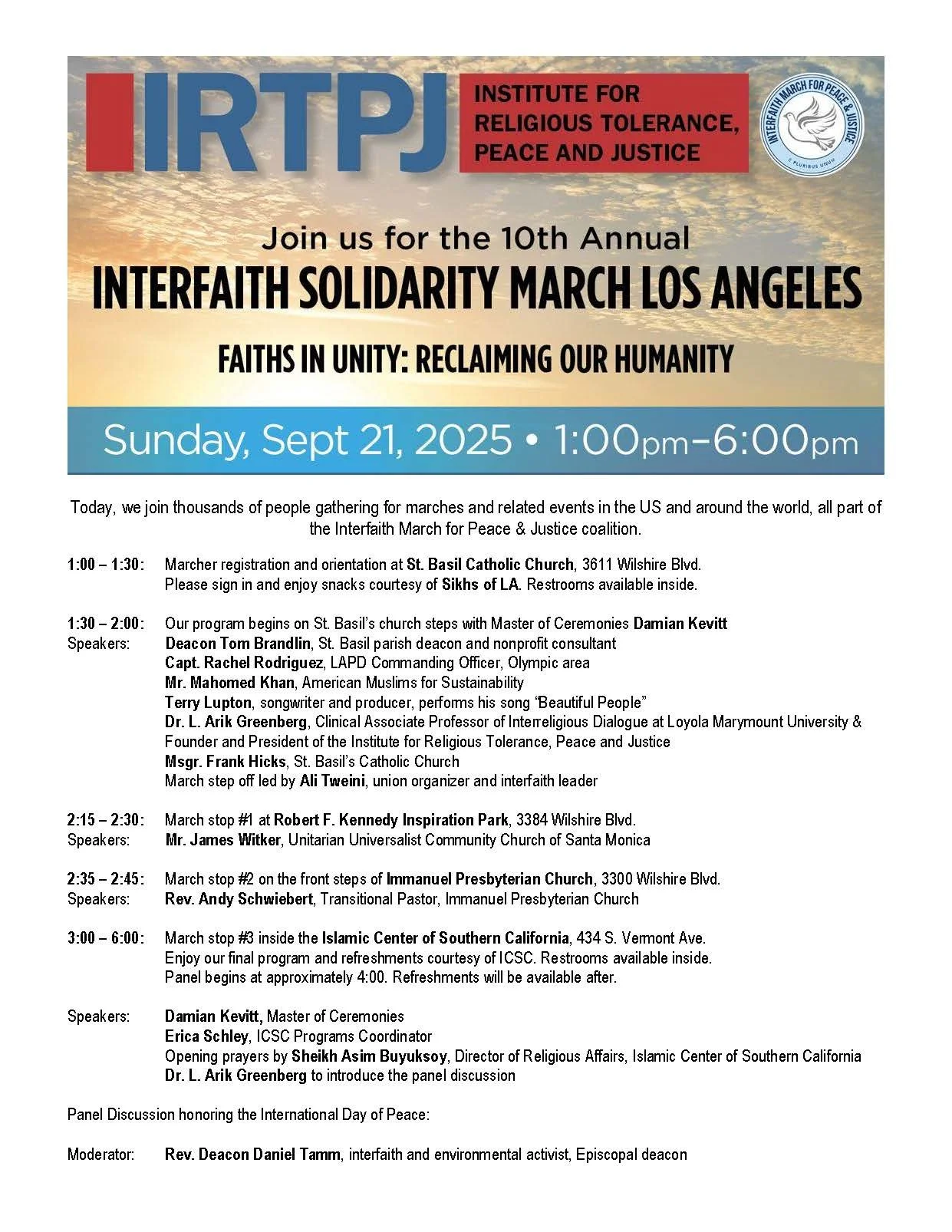 Produced by the Institute for Religious Tolerance, Peace and Justice, a 501(c)(3) nonprofit organization. The Interfaith Solidarity March LA is a flagship partner of the Interfaith March for Peace & Justice, the world’s largest coalition of interfaith marches.